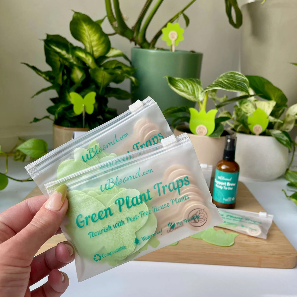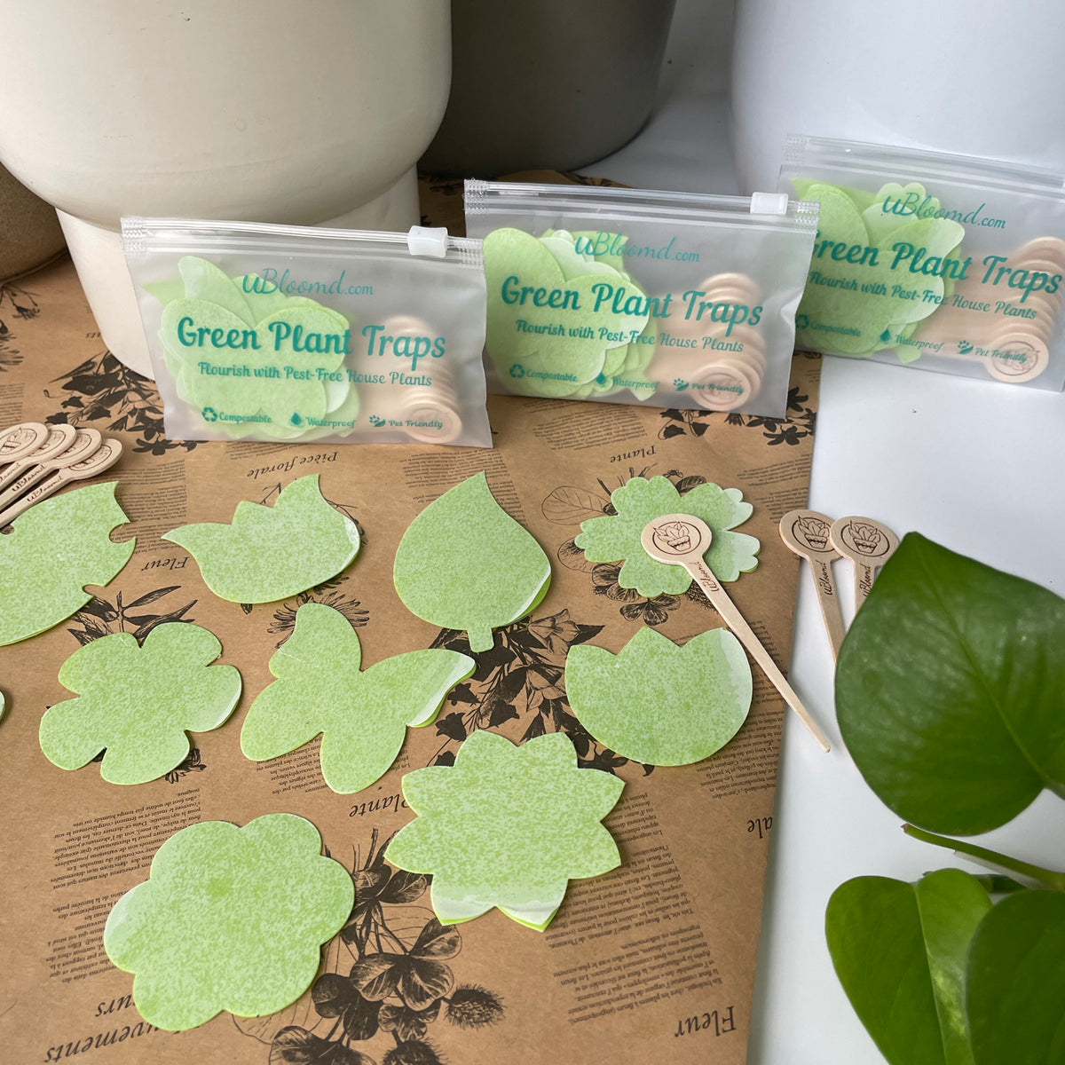 There are three designs available. Original Round, Monstera Leaf and new Nature Collection multi-pack with mixed shapes. One uBloomed kit includes: 10 stealth sticky traps, 10 biodegradable wooden support sticks, and an instructions card, all neatly in a compostable slide-zip bag.