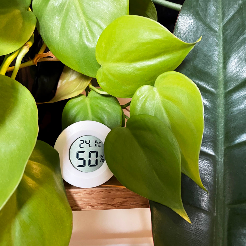 Many of our indoor plants prefer things warm and humid, with humidity on the higher side, such as Philodendron (70%+), Monstera (60%+), Calathea and Pothos (50%+). This little digital meter makes it easy to know when your plants need a humidity boost when humidity levels drop (check out the H2O cordless humidifiers if you don't have a humidifier yet, my plants love theirs).