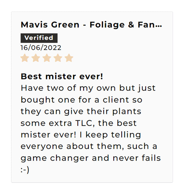 "Have two of my own but just bought one for a client so they can give their plants some extra TLC, the best mister ever! I keep telling everyone about them, such a game changer and never fails :-)" Mavis Green