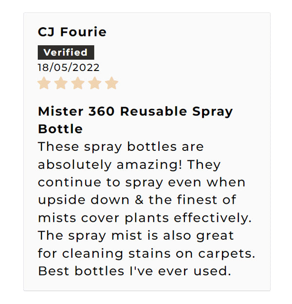 "These spray bottles are absolutely amazing! They continue to spray even when upside down & the finest of mists cover plants effectively. The spray mist is also great for cleaning stains on carpets. Best bottles I've ever used." CJ Fourie